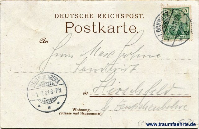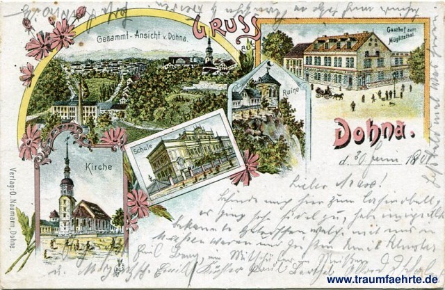 – Details – Jahr: ca. 1895 Status: gelaufen 1902 Beschriftung vorne: Gruss aus Dohna. d. ... 18..., Gesammt-Ansicht v. Dohna. Kirche, Schule, Ruine, Gasthof zum Müglitzthal. Verlag: O. Naumann, Dohna. Beschriftung hinten: Deutsche Reichspost. Postkarte. An ... in ... Wohnung (Straße und Hausnummer) ... Stempel: Lockwitz, * a *, -1.7.01.11-12V.; Deutschenbroda, * * *, -1.7.01.6-7N. Hinweis: