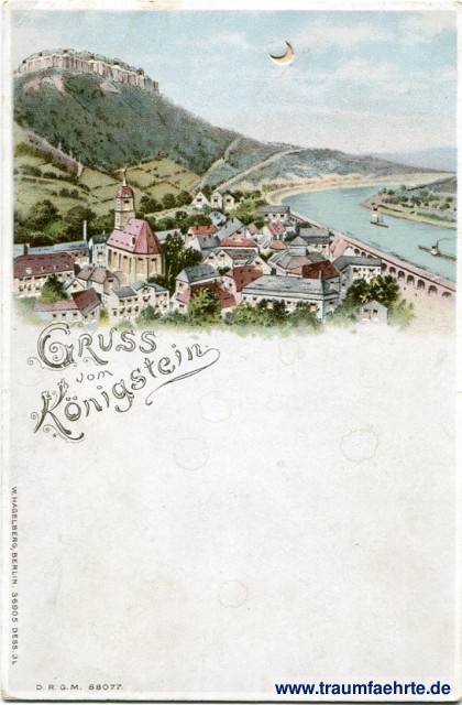 – Details – Jahr: ca. 1900 Status: ungelaufen Beschriftung vorne: Gruss vom Königstein. D. R. G. M. 88077, W. Hagelberg, Berlin. 36905 Dess 3L Beschriftung hinten: Postkarte, An ... In ... Wohnung (Straße und Hausnummer) ... Stempel: keine Hinweis: