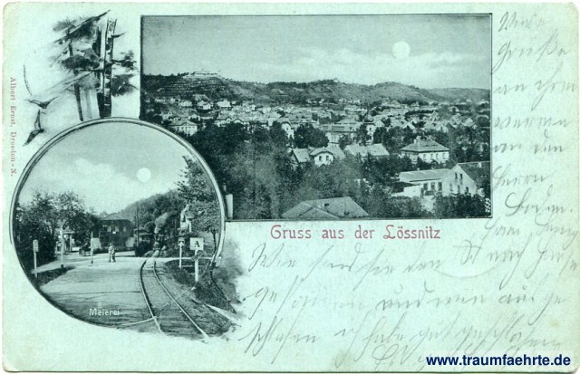 – Details – Jahr: ca. 1895 Status: gelaufen 1899 Beschriftung vorne: Gruss aus der Lössnitz, Albert Ernst, Dresden-N. Beschriftung hinten: Postkarte. Stempel: Kötzschenbroda, * b *, -7.11.99. 11-12V.; Co[...], * * *, -7.11.99.5-6N. Hinweis: