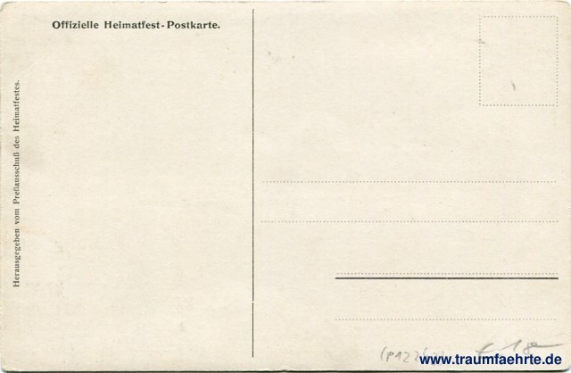 – Details – Jahr: 1908 Status: ungelaufen Beschriftung vorne: Heimatfest Mittweida, 11.-13. Juli 1908. P. Beyer Beschriftung hinten: Offizielle Heimatfest-Postkarte. Herausgegeben vom Preßausschuss des Heimatfestes. Stempel: keine Hinweis: