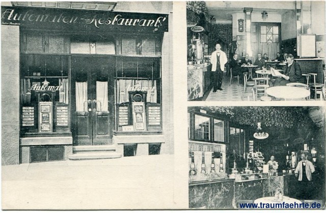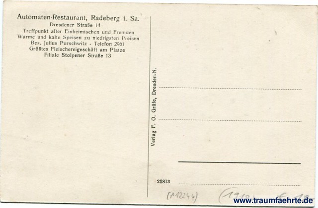 – Details – Jahr: ca. 1910 Status: ungelaufen Beschriftung vorne: Automaten-Restaurant, Automat, Automat, Div. Torten 20[...], Div. Kuchen 20[...], Baise 10[...], [...] Brötchen 10[...], Bouillon 15[...], Schlagsahne 10[...], Tafel Schokolade, Ansichtskarten, [...] Brot 25[...], [...] Aufschnitt 50[...], [...] Aufschnitt 40[...], Würstchen[...], Semmel 25[...], Salat 30[...], div. Liköre 10[...], div. Biere 10[...], div. Weine 10[...], [...] Limonaden, S[...], Cigaretten, Cigarren, Eis, Warme Getränke, Kasse Beschriftung hinten: Automaten-Restaurant, Radeberg i. Sa., Dresdner Straße 14, Treffpunkt aller Einheimischen und Fremden, Warme und kalte Speisen zu niedrigsten Preisen, Bes. Julius Purschwitz – Telefon 2961, Größtes Fleischereigeschäft am Platze, Filiale Stolpener Straße 13, Verlag F. =. Gräfe, Dresden-N., 21813 Stempel: keine Hinweis: