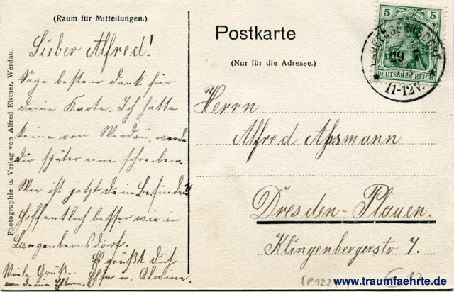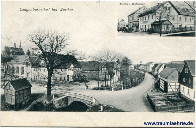 – Details – Jahr: ca. 1900 Status: gelaufen 1903 Beschriftung vorne: Langenbernsdorf bei Werdau, Piehler's Restaurant Beschriftung hinten: Postkarte, (Nur für die Adresse.), (Raum für Mitteilungen.), Photographie u. Verlag von Alfred Elstner, Werdau. Stempel: Langenbernsdorf, 29 7 03, 11-12V. Hinweis: