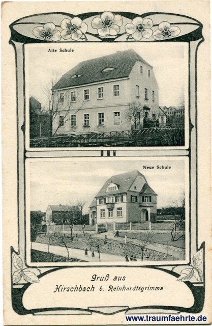 – Details – Jahr: ca. 1920 Status: ungelaufen Beschriftung vorne: Gruß aus Hirschbach b. Reinhardtsgrimma, Alte Schule, Neue Schule Beschriftung hinten: Postkarte. 25101 Kunstverlag Hugo Opitz. Dresden-Leubnitz Stempel: keine Hinweis: