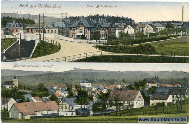 Beschriftung vorne: Gruß aus Großharthau, Neuer Bahnübergang, Aussicht nach dem Schloß