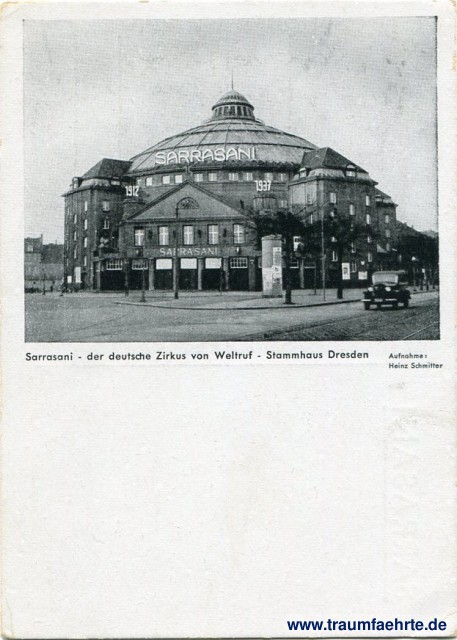 Beschriftung vorne: Sarrasani – der deutsche Zirkus von Weltruf – Stammhaus Dresden, Aufnahme: Heinz Schmitter
