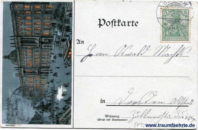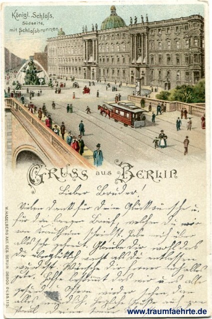 – Details – Year: ca. 1900 Postal state: postally used 1901 Inscription front: Gruss aus Berlin, Königl. Schloss, Südseite, mit Schlossbrunnen. W. Hagelberg Akt. Ges. Berlin, 36900 Dess. 113. Inscription back: Königl. Schloss, Südseite, bei Nacht. Ges. gesch. Postkarte, An ... in ... Wohnung (Straße und Hausnummer) ... Postmark(s): B[erlin ... W.], * 30 a, 9.2.01 11-12; [...] Please note: