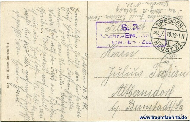 – Details – Jahr: ca. 1915 Status: gelaufen ohne Briefmarke (Feldpost), 1918 Beschriftung vorne: Dresden-Uebigau, Kaserne der Nachrichten-Ersatz-Abtg 12 Beschriftung hinten: 443 Otto Günther, Dresden N 15 Stempel: Dresden-Neust. 31, a, 30. 7. 18.12-1 N; S. [B.] Nachr.-Ers.-[...], [...]-Ers.-Zug Hinweis: