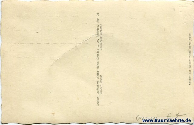 Beschriftung hinten: Original-Aufnahme Walter Hahn, Dresden-A. 24, Godeffroy-Str. 26, Fernruf: 42 222, Nachdruck verboten, Kopiert auf Weber-Madio Sorte Alpen