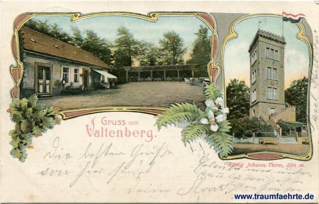 – Details – Jahr: ca. 1900 Status: gelaufen 1904 Beschriftung vorne: Gruss vom Valtenberg. König-Johann-Turm, 586 m. Beschriftung hinten: Postkarte, ... Wohnung (Straße und Hausnummer) ..., Deubner & Scholze, Lith. Kunst-Anstalt, Bautzen. Stempel: Niederneukirch (Lausitz), 16 5 04, 11-12V.; Schandau, * 1 *, 16.5.04.6-7N; Valtenberg Hinweis: