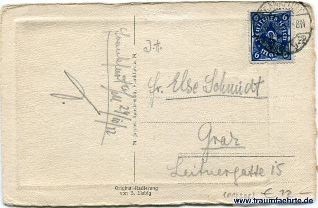 – Details – Jahr: ca. 1920 Status: gelaufen 1922 Beschriftung vorne: B. Liebig Beschriftung hinten: Original-Radierung von B. Liebig, M. Jacobs. Kunstanstalt, Frankfurt a. M. Stempel: Frankfurt (Main), [...], pp, 29.10.22 7-8N Hinweis:
