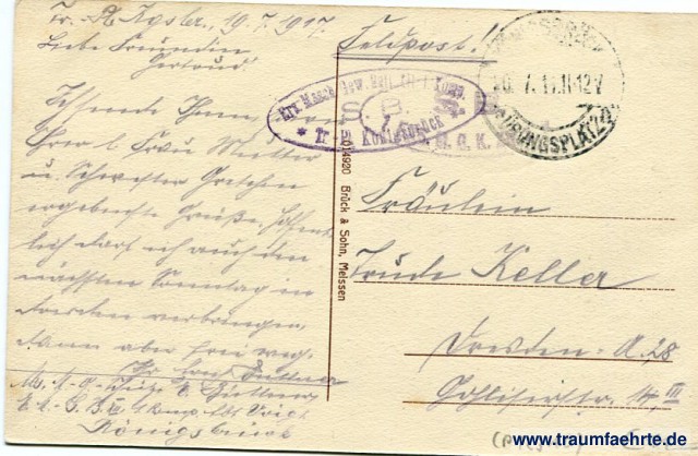– Details – Jahr: 1912 Status: gelaufen ohne Briefmarke (Feldpost), 1917 Beschriftung vorne: Königsbrück. – Dresdner Straße. Beschriftung hinten: 014920 Brück & Sohn, Meissen Stempel: Königsbrück * Übungsplatz a, 10.7.17.11-12V.; S.B., Ers. Masch. Gew. Batt. [...] 1. Komp. Tr.-[...] Königsbrück; S.B. [...] 1. [...] Hinweis: