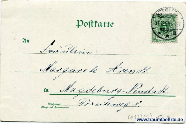 – Details – Jahr: ca. 1895 Status: gelaufen 1899 Beschriftung vorne: Gruss aus Berlin, Neuer Dom. W. Hagelberg Akt. Ges. Berlin 36900 Dess. 84. Beschriftung hinten: Postkarte, An ... in ... Wohnung (Straße und Hausnummer) ... Stempel: Berlin, [...] * *, 31.12.99 4-5N. Hinweis:
