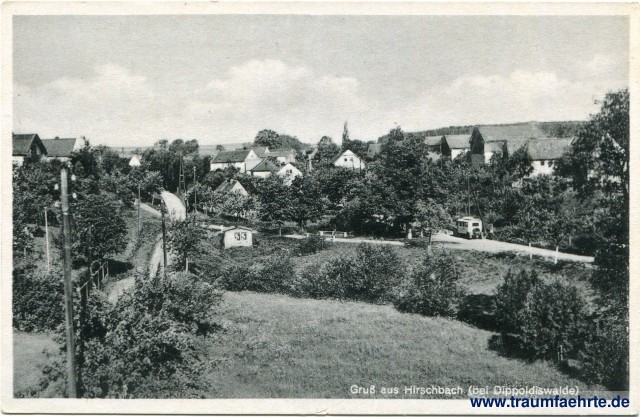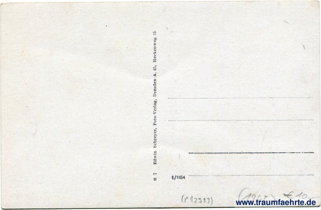 – Details – Year: ca. 1945 Postal state: postally unused Inscription front: Gruß aus Hirschbach (bei Dippoldiswalde) Inscription back: n 7 Edwin Schreyer, Foto-Verlag, Dresden-A. 45, Heckenweg 15, E/1184 Postmark(s): none Please note: