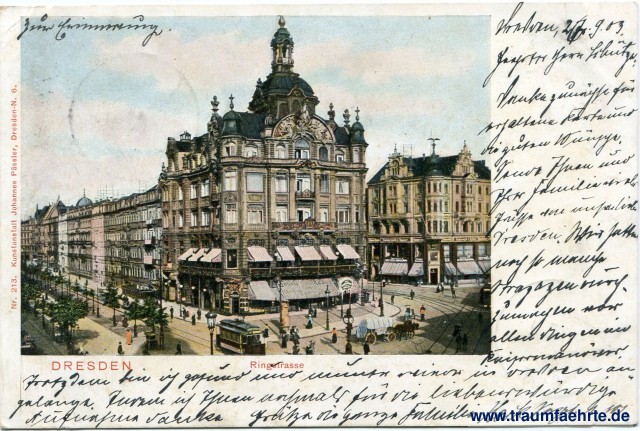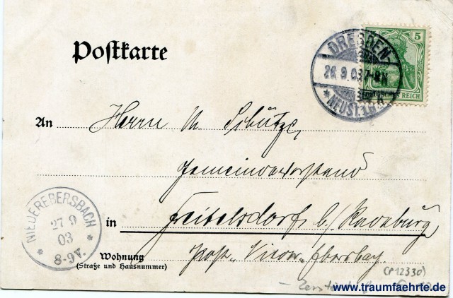 – Details – Year: ca. 1900 Postal state: postally used 1903 Inscription front: Dresden, Ringstrasse, Nr. 213. Kunstanstalt Johannes Pässler, Dresden-N. 6. Inscription back: Postkarte, An .. in ... Wohnung (Straße und Hausnummer) ... Postmark(s): Dresden Neust., 1[b], * [...], 26.9.03.7-8N.; Niederebersbach, * *, 27 9 03 8-9V. Please note:
