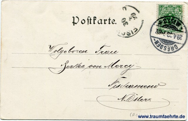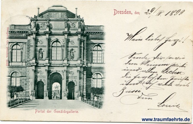 – Details – Jahr: ca. 1895 Status: gelaufen 1899 Beschriftung vorne: Dresden, den ... Portal der Gemäldegallerie. Beschriftung hinten: Postkarte. Stempel: Dresden-Altst. 3, g, 29.4.99 7-8V.; Eis[...], 30 4 99 Hinweis: