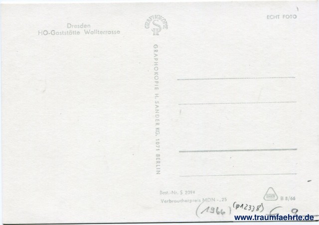 – Details – Year: 1966 Postal state: postally unused Inscription front: no text Inscription back: Dresden, HO-Gaststätte Wallterrasse, Echt Foto, Graphokopie, S H, Graphokopie H. Sander KG, 1071 Berlin, Best.-Nr. S 2094, Verbraucherpreis MDN -,25, DAMW, B 8/66 Postmark(s): none Please note: