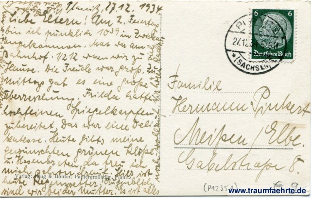 – Details – Jahr: ca. 1930 Status: gelaufen 1934 Beschriftung vorne: Planitz i. Sa. Jünglingsheim, Vereinshaus, Ortskrankenkasse Beschriftung hinten: Verlag: Klug & Döhler, Papiergroßhdlg., Planitz Stempel: Planitz (Sachsen), * [...], 27.12.34.5-6N Hinweis: