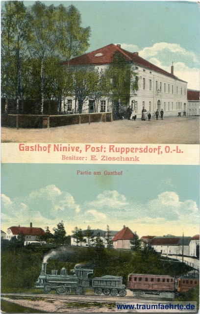 Inscription front: Gasthof Ninive, Post: Ruppersdorf, O.-L. Besitzer: E. Zieschank, Partie am Gasthof