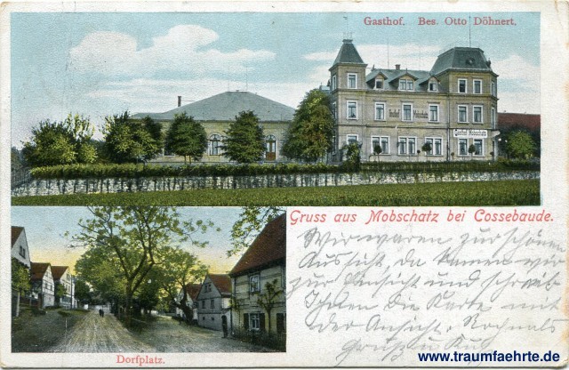 Beschriftung vorne: Gruss aus Mobschatz bei Cossebaude. Gasthof. Bes. Otto Döhnert. Dorfplatz.