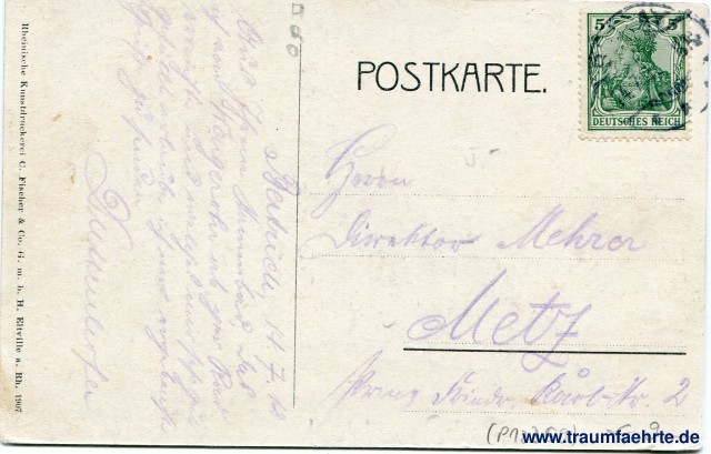 – Details – Jahr: 1907 Status: gelaufen Beschriftung vorne: Hôtel Pitz Kurhôtel Bad-Bertrich. Hotel Pitz – Kurhotel, Hotel Pitz – Kurho[tel] Beschriftung hinten: Postkarte. Rheinische Kunstdruckerei C. Fischer & Co. G. m. b. H. Eltville a. Rh. 1907 Stempel: [...], 14.7.[...] Hinweis: