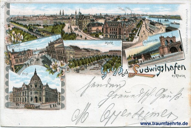 coloured lithography with five views – 1st) panorama of Ludwigshafen with Rhine river, sailing ships, steam ship, train with steam locomotive, chimneys, towers, alleys and pedestrians, 2nd) train station, tram, lanterns and pedestrians, 3rd) market square with trees, houses and pedestrians, 4th) Rhine bridge with pedestrians in front, 5th) post office with dome, horse-drawn tram and pedestrians in front
