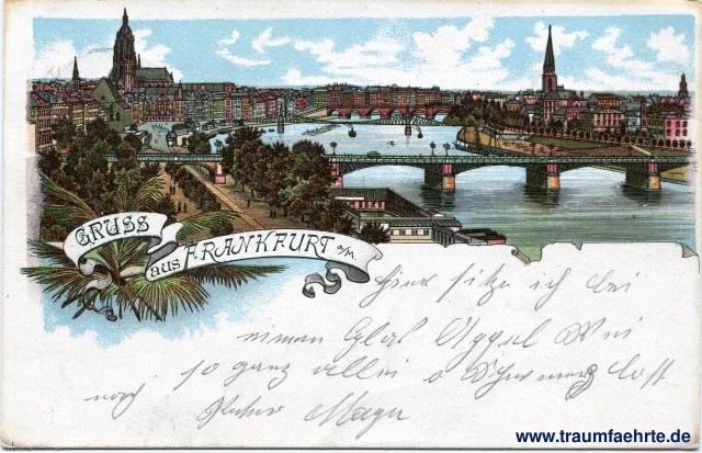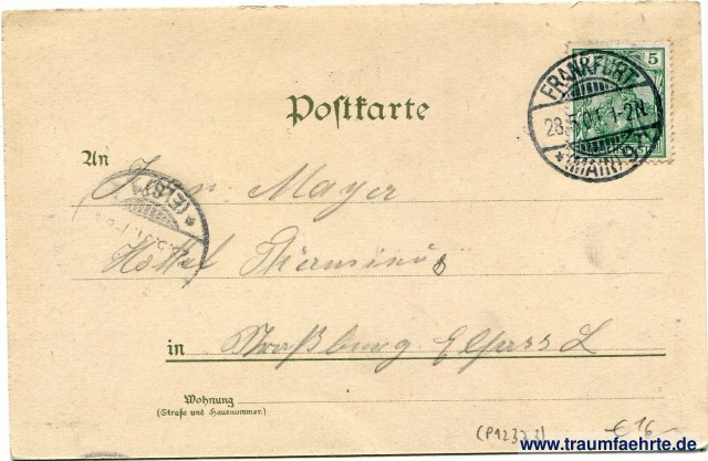– Details – Jahr: ca. 1900 Status: gelaufen 1901 Beschriftung vorne: Gruss aus Frankfurtr a/M. Beschriftung hinten: Postkarte, An ... in ... Wohnung (Straße und Hausnummer) ... Stempel: Frankfurt (Main) 9, * T, 28.5.01. 1-2N; [...] (Els.), 28.5.01. 7-8[N] Hinweis: