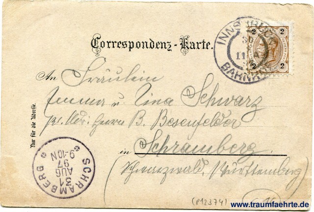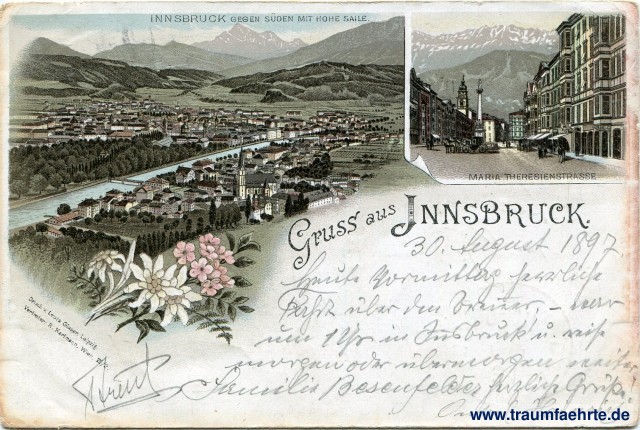 – Details – Jahr: ca. 1895 Status: gelaufen 1897 Beschriftung vorne: Gruss aus Innsbruck. Innsbruck gegen Süden mit Hohe Saile. Maria Theresienstrasse, Druck v. Louis Glaser, Leipzig. Vertreter: R. Karlmann, Wien. VII/2. Beschriftung hinten: Correspondenz-Karte. An ... in ... Nur für die Adresse. Stempel: Innsbruck Bahnhof, 30 [...] 97, 11 A; Schramberg, 31 Aug 97, 9-10N Hinweis: