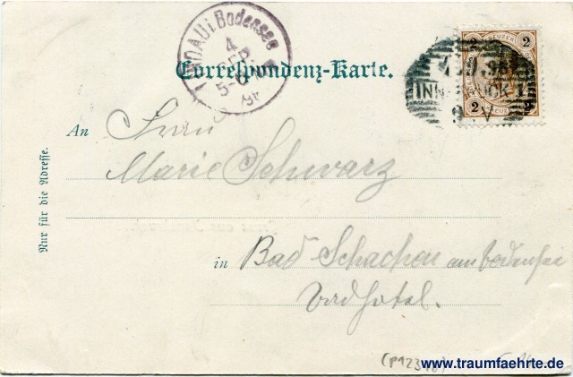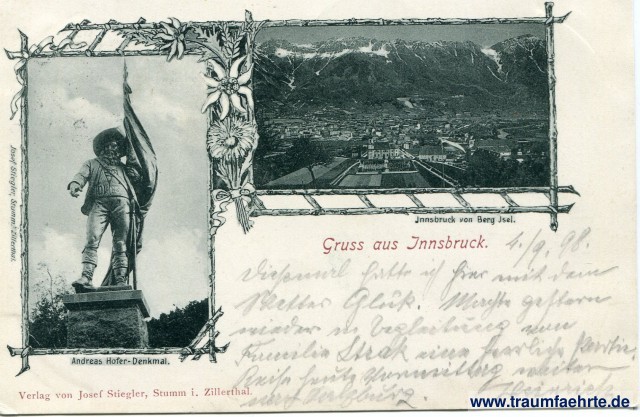 – Details – Jahr: ca. 1895 Status: gelaufen 1898 Beschriftung vorne: Gruss aus Innsbruck. Andreas Hofer-Denkmal. Innsbruck von Berg Isel. Verlag von Josef Stiegler, Stumm i. Zillerthal. Josef Stiegler, Stumm i/ Zillerthal. Beschriftung hinten: Correspondenz-Karte. An ... in ... Nur für die Adresse. Stempel: Innsbruck 1, 4.9.98, 9 V; Lindau i. Bodensee, 4 Sep 98, 5-6 Nm. Hinweis:
