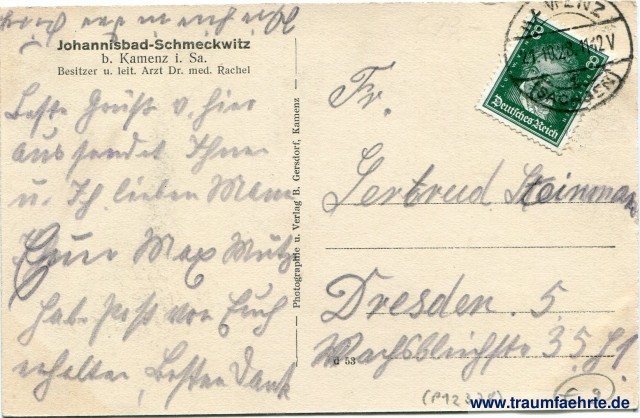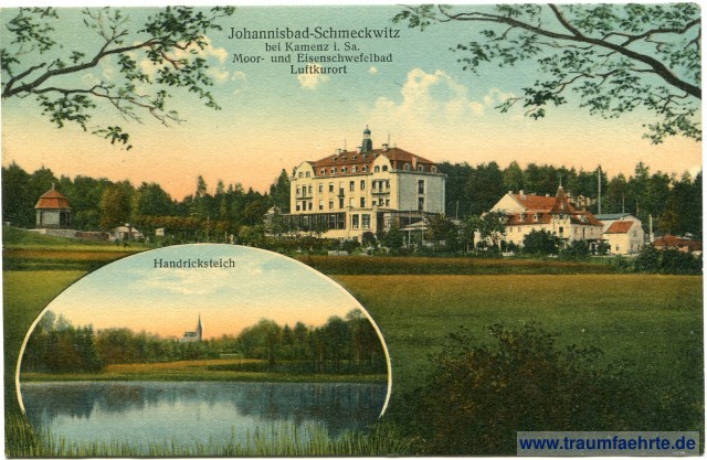 – Details – Jahr: ca. 1925 Status: gelaufen 1928 Beschriftung vorne: Johannisbad-Schmeckwitz bei Kamenz i. Sa. Moor- und Eisenschwefelbad, Luftkurort, Handricksteich Beschriftung hinten: Johannisbad-Schmeckwitz b. Kamenz i. Sa. Besitzer u. leit. Arzt Dr. med. Rachel, Photographie u. Verlag B. Gersdorf, Kamenz, d 53 Stempel: Kamenz (Sachsen), 1, 21.10.28.11-12V Hinweis:
