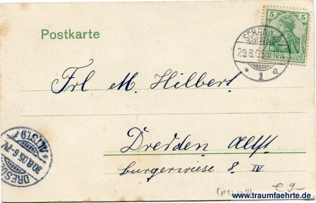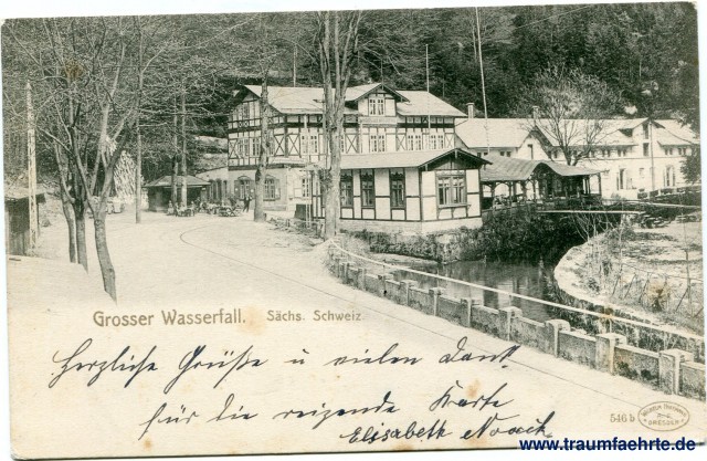 – Details – Jahr: ca. 1900 Status: gelaufen 1905 Beschriftung vorne: Grosser Wasserfall. Sächs. Schweiz. 546 b, Wilhelm Hoffmann, A. G, Dresden Beschriftung hinten: Postkarte Stempel: Schandau, * 1 a, 29.8.05.9-10N; Dresden-Altst. 9, * f, 30.8.05.6-7V. Hinweis: