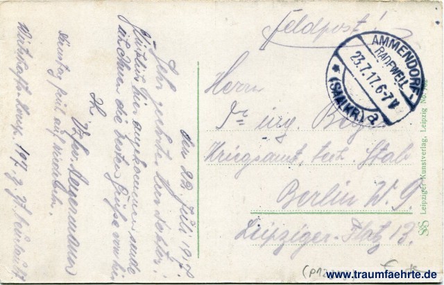 – Details – Year: ca. 1915 Postal state: postally used without stamp (military mail), 1917 Inscription front: Halle a. S. Leipziger Turm. Inscription back: S&S Leipziger Kunstverlag, Leipzig No. 702 Postmark(s): Ammendorf-Radwell (Sallkr.), * a, 23.7.17.6-7V Please note: