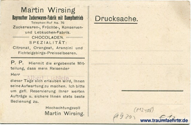 – Details – Jahr: ca. 1920 Status: ungelaufen Beschriftung vorne: Bayreuth – Richard Wagner-Festspielhaus, seitlich. Beschriftung hinten: Drucksache. Martin Wirsing, Bayreuther Zuckerwaren-Fabrik mit Dampfbetrieb, Telephon-Ruf No. 76, Zuckerwaren-, Früchte-, Konserven- und Lebkuchen-Fabrik. Chocoladen. Spezialität: Citronat, Orangeat, Arancini und Fichtelgebirgs-Preisselbeeren. P. P. Hiermit die ergebenste Mitteilung, dass mein Reisender Herr [Albert Lieblein] dieser Tage sich erlauben wird, Ihnen seine Aufwartung zu machen. Ich bitte um gefl. Reservierung Ihrer werten Aufträge u. sichere Ihnen stets beste Bedienung zu. Hochachtungsvoll, Martin Wirsing. Stempel: Albert Lieblein Hinweis: