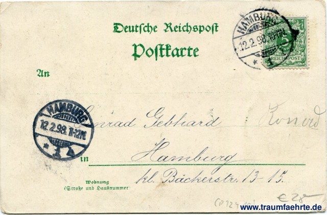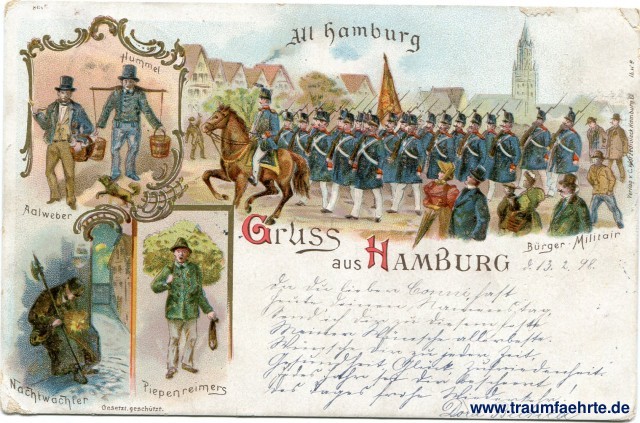 – Details – Year: ca. 1895 Postal state: postally used 1898 Inscription front: All Hamburg, Gruss aus Hamburg, Aalweber, Hummel, Nachtwächter, Piepenreimers, Bürger-Militair, Gesetzl. geschützt. Inscription back: Deutsche Reichspost, Postkarte, An ... in ... Wohnung (Straße und Hausnummer) ... Postmark(s): Hamburg, * 1 l, 12.2.98.10-11N; Hamburg, * [1 ...], 12.2.98.11-12N Please note: