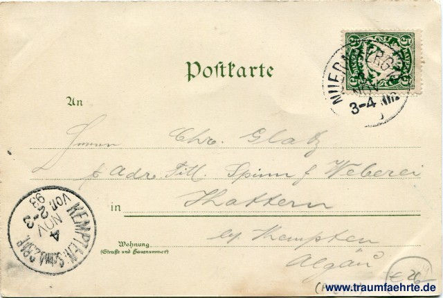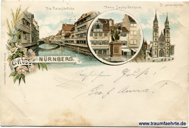 – Details – Jahr: ca. 1895 Status: gelaufen 189(8?) Beschriftung vorne: Gruss aus Nürnberg. Die Fleischbrücke. Hans Sachs-Denkmal. St. Lorenzkirche. Ottmar Zieher, München. Beschriftung hinten: Postkarte, An ... in ... Wohnung (Straße und Hausnummer) ... Stempel: Nuernberg, 3 Nov [98], 3-4 Nm.; Kempten, Schwb, 28 [...], 4 Nov 9[8] Hinweis: