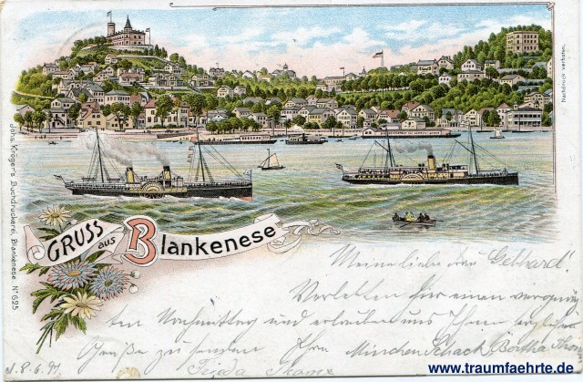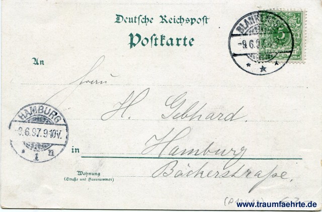 – Details – Jahr: ca. 1895 Status: gelaufen 1897 Beschriftung vorne: Gruss aus Blankenese, Johs. Kröger's Buchdruckerei, Blankenese. No. 625. Nachdruck verboten. Beschriftung hinten: Deutsche Reichspost, Postkarte, An ... in ... Wohnung (Straße und Hausnummer) ... Stempel: Blankenese, * * *, -9.6.97.6-7V.; Hamburg, * 1 n, -3.6.97.9-10V. Hinweis:
