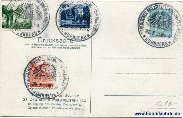 – Details – Year: 1921 Postal state: postmarked 1921, without address Inscription front: 27. Deutscher Philatelistentag Nürnberg. Fritz Schneller Co. Nürnberg. Inscription back: Drucksache. Nur 5 Höflichkeitsworte und Name des Absenders und zwar nur auf der Adreßseite gestattet. Nürnberg, 22.-25. Juli 1921, 27 Deutscher Philatelisten-Tag, 19. Tagung des Bundes Deutscher u. Österreichischer Philatelisten-Vereine Postmark(s): 4x 7. Deutscher Philatelistentag und 19. Bundestag, 22.7.21.N3 Please note: