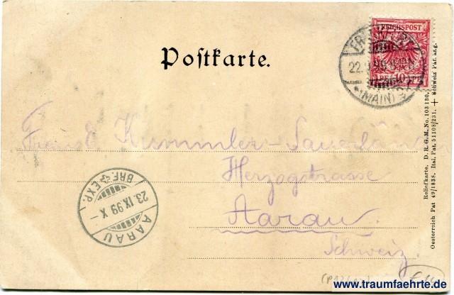 – Details – Jahr: ca. 1895 Status: gelaufen 1899 Beschriftung vorne: Frankfurt a. M., Palmengarten, Reliefkarte 594 L. Klement, Frankfurt a. M. Beschriftung hinten: Postkarte. Reliefkarte. D. R. G M. No. 103 130. Oesterreich Pat. 49/1838. Ital. Pat. 51108/231. + Schweiz Pat. ang. Stempel: Frankfurt (Main) 9 r, 22.9.99 9-10N.; Aarau, Brf. + Exp., 23.IX.99 X - Hinweis: