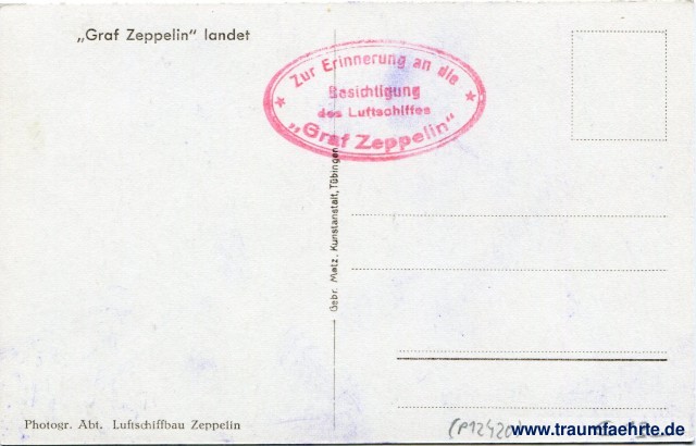 – Details – Jahr: ca. 1930 Status: ungelaufen Beschriftung vorne: kein Text Beschriftung hinten: Graf Zeppelin landet, Photogr. Abt. Luftschiffbau Zeppelin, Gebr. Metz, Tübingen Stempel: Zur Erinnerung an die Besichtigung des Luftschiffes Graf Zeppelin Hinweis: