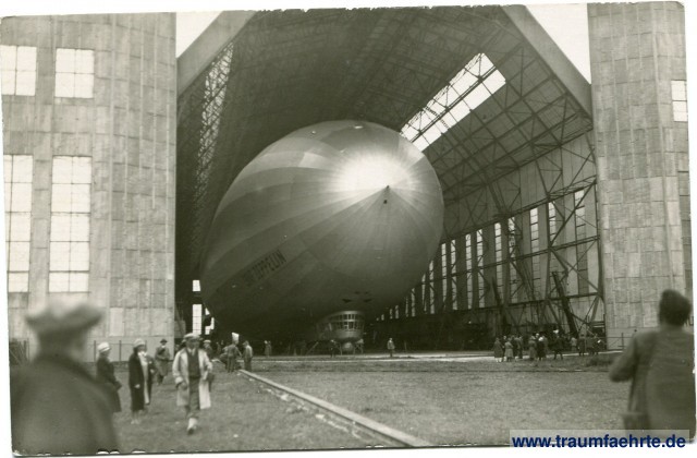 monochrome photograph – Graf Zeppelin airship in airship hall, spectators