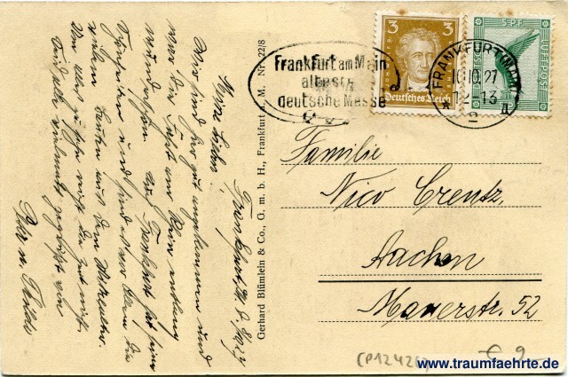 – Details – Jahr: ca. 1925 Status: gelaufen 1927 Beschriftung vorne: Frankfurt a. Main. Hauptwache Beschriftung hinten: Gerhard Blümlein & Co., G. m. b. H., Frankfurt a. M. Nr. 22/8 Stempel: Frankfurt (Main), * 2 [...], 10 10 27, 12-13; Frankfurt am Main, [älteste] deutsche Messe Hinweis: