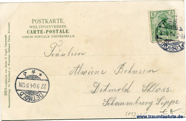 – Details – Year: ca. 1900 Postal state: postally used 1904 Inscription front: Essen a. d. Ruhr, Hauptbahnhof. Inscription back: Postkarte. Weltpostverein. Carte-postale. Union postale universelle. 3803 Lichtdruck von Zdler & Vogel, Darmstadt. Hauptniederlage für Rheinland u. Westfalen Gerhard Thien, Elberfeld. Postmark(s): Essen (Ruhr), 1 g, 27.9.04 2-3N; Detmold, * * b, 27.9.04.11-12N. Please note: