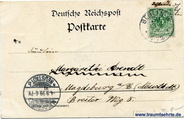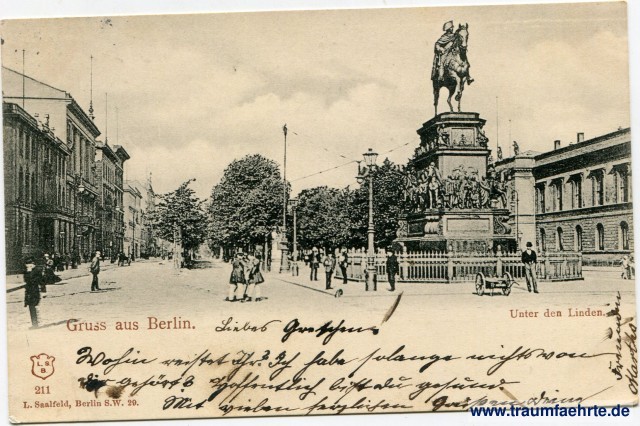 – Details – Jahr: ca. 1895 Status: gelaufen 1899 Beschriftung vorne: Gruss aus Berlin. Unter den Linden. L. S. B. 211 L. Saalfeld, Berlin S.W. 29. Beschriftung hinten: Deutsche Reichspost, Postkarte, An ... in ... Wohnung (Straße und Hausnummer) ... Stempel: Berlin W. 30, [...], 3 9 99, [...] N.; Magdeburg-Neustadt, * b, -4.9.99.6-7V. Hinweis: