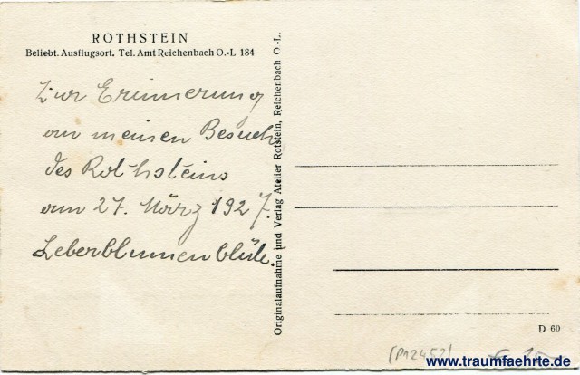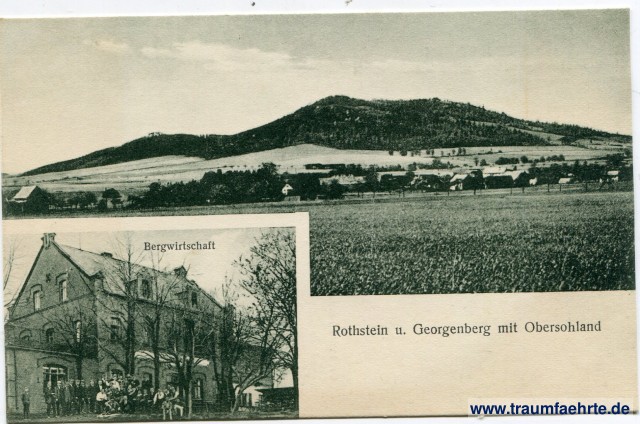 – Details – Jahr: ca. 1925 Status: ungelaufen Beschriftung vorne: Rothstein u. Georgenberg mit Obersohland, Bergwirtschaft Beschriftung hinten: Rothstein, Beliebt. Ausflugsort. Tel. Amt Reichenbach O.-L 184, Originalaufnahme und Verlag Atelier Rotstein, Reichenbach O.-L, D 60 Stempel: keine Hinweis: