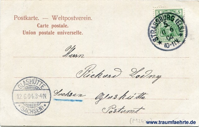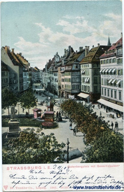 – Details – Jahr: 1903 Status: gelaufen 1904 Beschriftung vorne: Strassburg i. E. Gutenbergplatz mit Gewerbslauben, D T Co, Dr. Trenkler Co., Leipzig. 1903. 16 507 Beschriftung hinten: Postkarte. – Weltpostverein. Carte postale. Union postale universelle. Stempel: Strassburg (Els.), 5., *, 11 6 04, 10-11V.; Glashütte (Sachsen), * *, 12.6.04.3-4N. Hinweis: