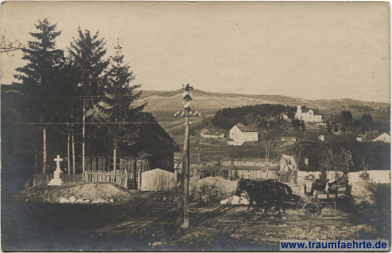 Schwarzweißfotografie – Dorfstraße in Galizien mit Kutsche, Strommast, Kreuz, Holzzaun, Häusern und Bäumen, Haus mit Turm im Hintergrund