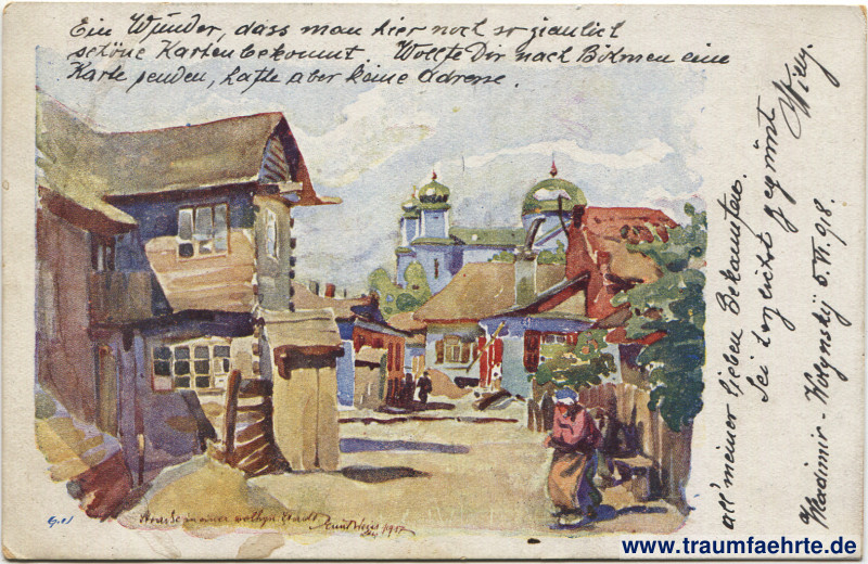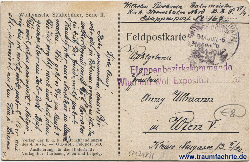 – Details – Year: 1917 Postal state: postally used without stamp (military mail), 1918 Inscription front: Straße in einer wolhyn. Stadt, […] Weiss 1917 Inscription back: Feldpostkarte, Wolhynische Städtebilder, Serie II. Verlag der k. u. k. Feldbuchhandlungen des 3. A.-K. – Qu.-Abt., Feldpost 340. Auslieferung für das Hinterland: Verlag Karl Harbauer, Wien und Leipzig. Postmark(s): […]ahivatal, […], [1]918 Jun. – 6.; Etappenbezirkskommando Wladimir Wol. Expositor Please note: