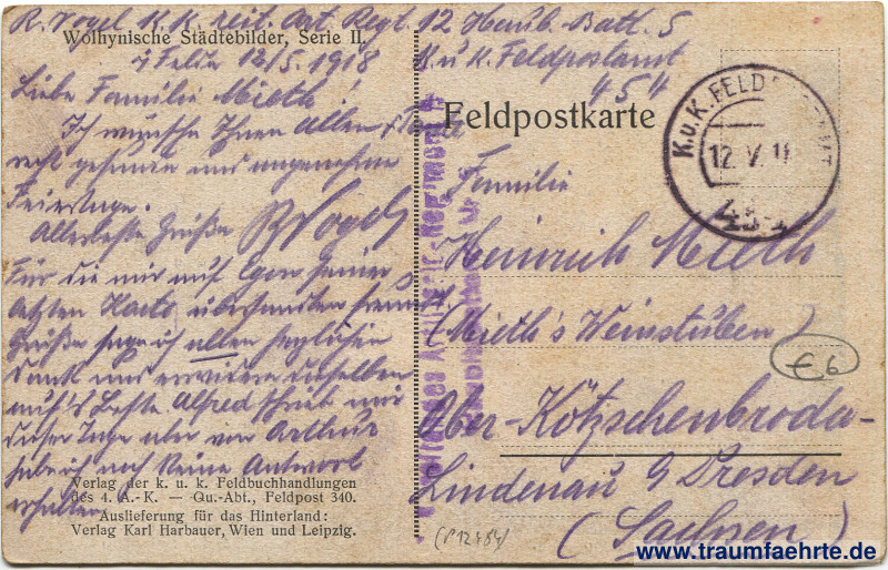 – Details – Jahr: 1918 Status: gelaufen ohne Briefmarke (Feldpost), 1918 Beschriftung vorne: wolhyn. Kirche, […] Weiss 1918 Beschriftung hinten: Feldpostkarte, Wolhynische Städtebilder, Serie II. Verlag der k. u. k. Feldbuchhandlungen des 3. A.-K. – Qu.-Abt., Feldpost 340. Auslieferung für das Hinterland: Verlag Karl Harbauer, Wien und Leipzig. Stempel: K. u. K. Feldlazarett, 45[…], 12. V. 18; […] des Artillerie-Regiments […]lazarett Nr. [3?] Hinweis: