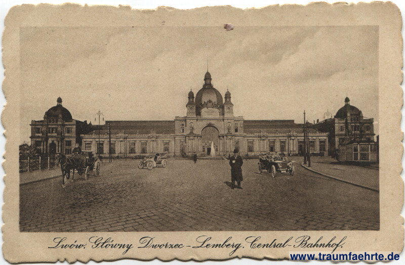 Beschriftung vorne: Lwów. Główny Dworzec – Lemberg. Central-Bahnhof.