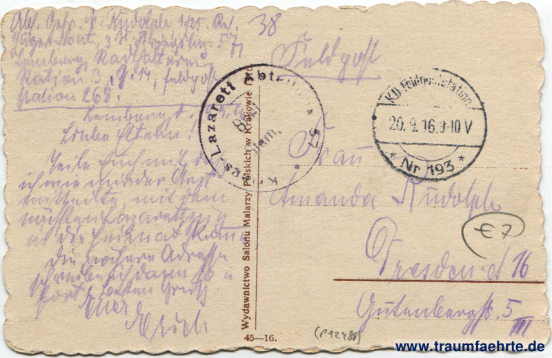 – Details – Jahr: 1916 Status: gelaufen ohne Briefmarke (Feldpost), 1916 Beschriftung vorne: Lwów. Teatr. Lemberg. Theater. Beschriftung hinten: Wydawnictwo Salonu Malarzy Polskich w Krakowie. 1916. 45–16. Stempel: Kriegs-Lazarett Abteilung 57, Briefstempel; K.D. Feldpoststation, * Nr. 193 *, 20.9.16.9–10 V Hinweis: