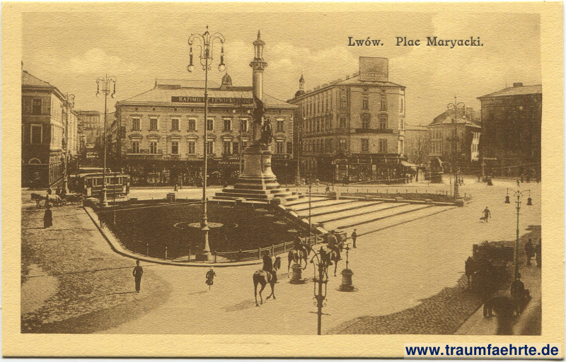 Ansichtskarte Adam-Mickiewicz-Platz / Площа Міцкевича in Lwiw / Lemberg / Lwów [ Permalink ]Schlagworte: Plätze, Säulen, Statuen, Straßenbahnen, Kutschen, Reiter, Pferde, Laternen, Werbung, Galizien